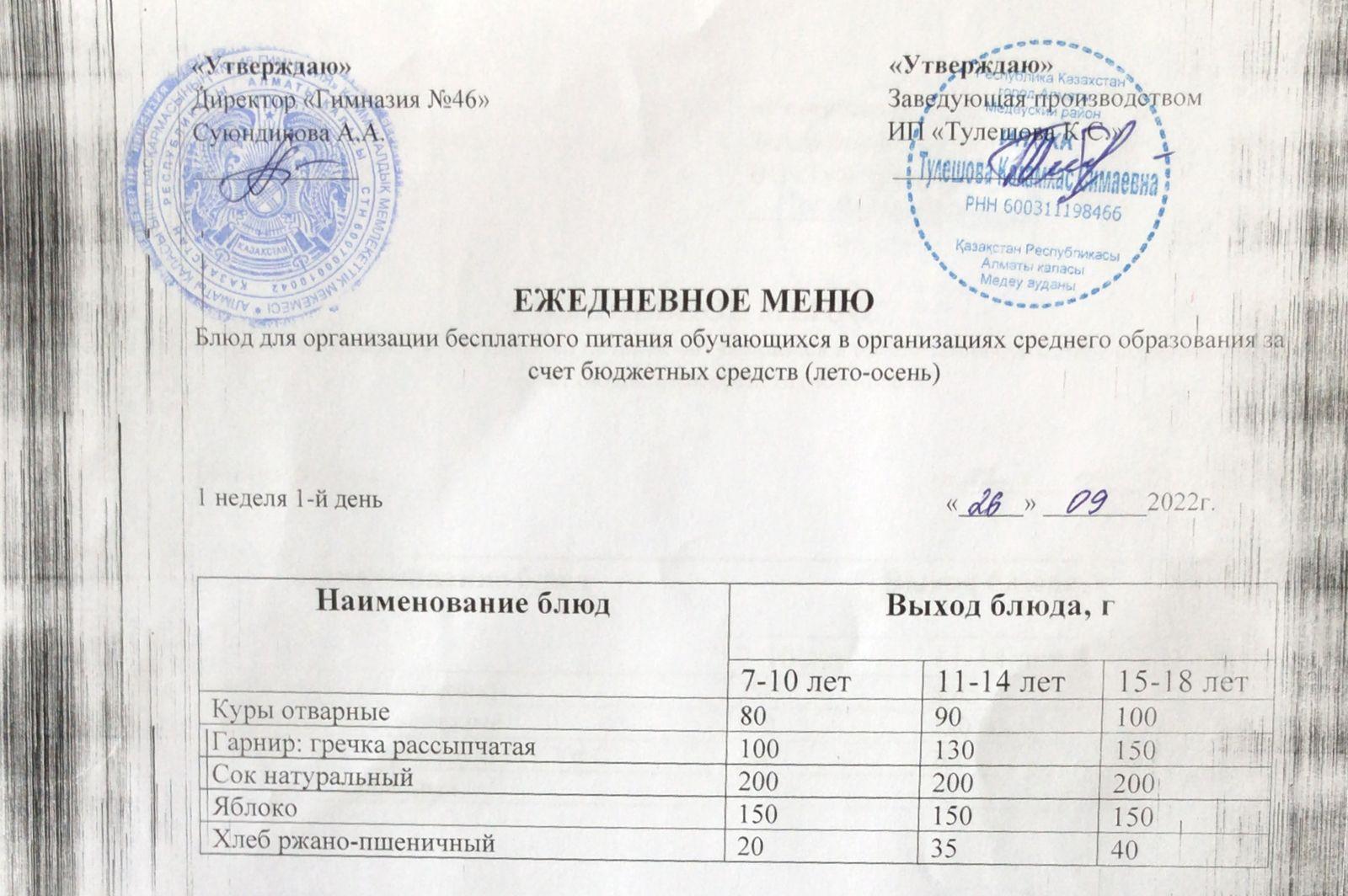 » Ас мәзірі 26.09.2022ж. Меню на 26.09.2022г.