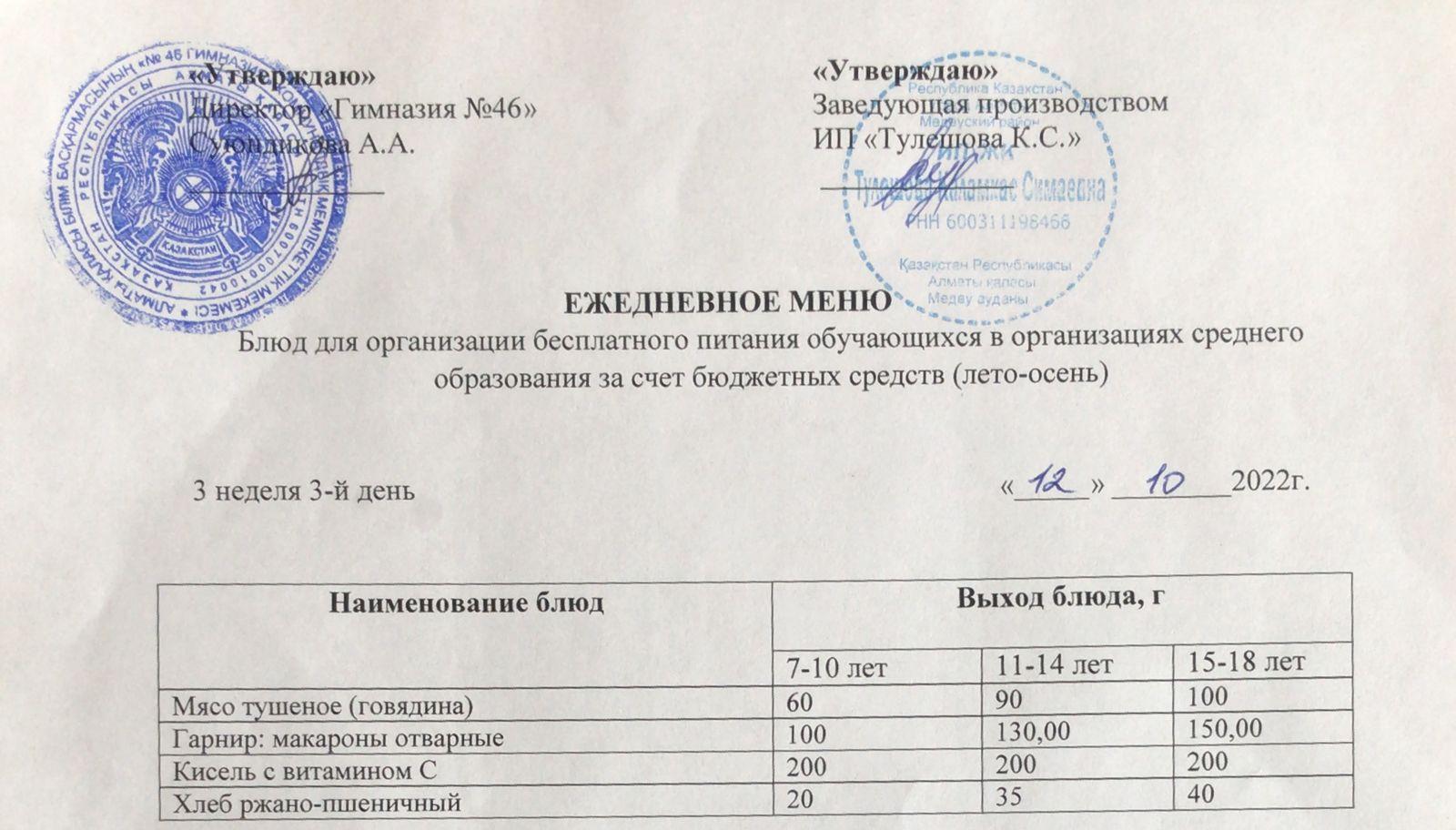 » Ас мәзірі 12.10.2022ж. Меню на 12.10.2022г.