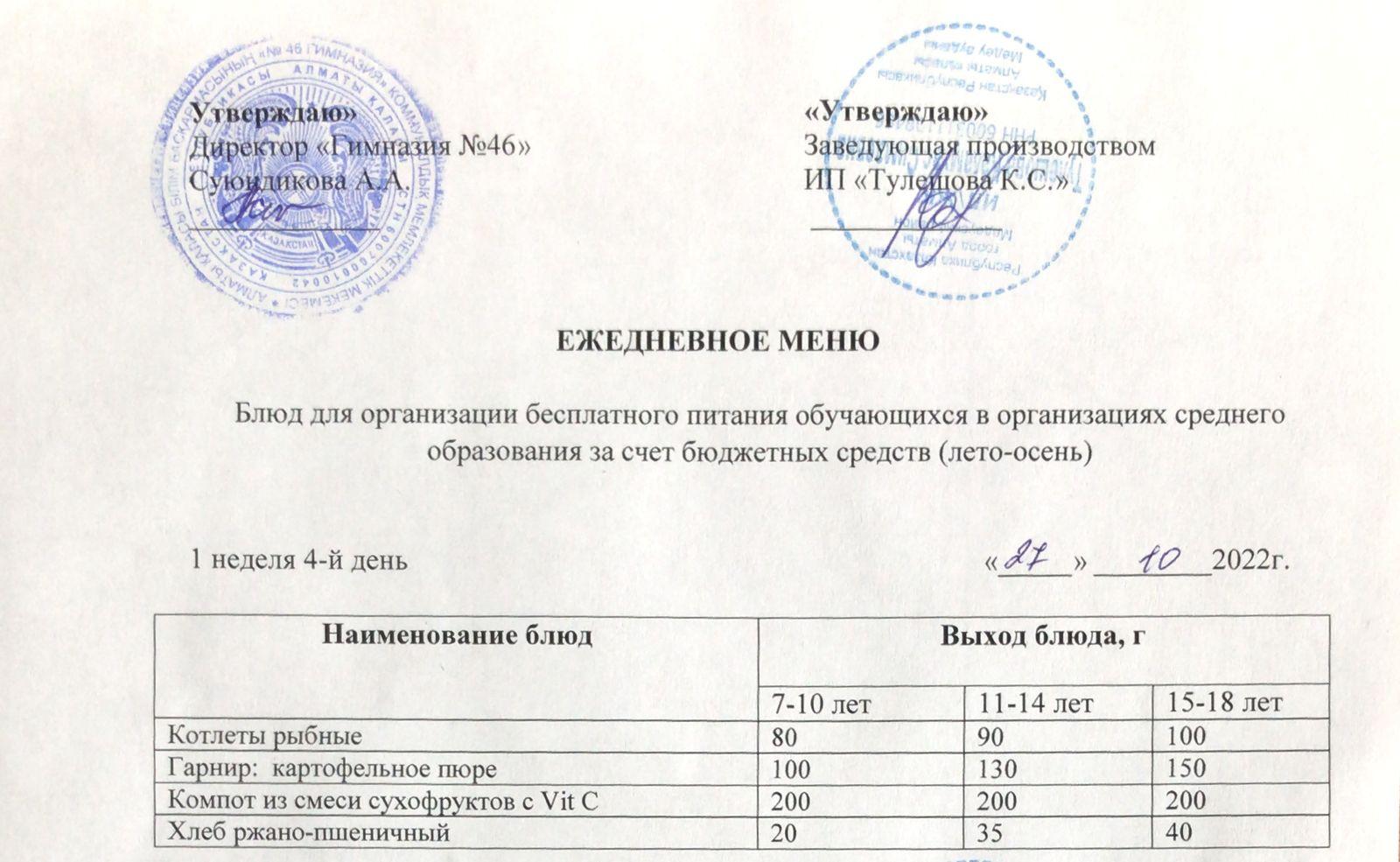 » Ас мәзірі 27.10.2022ж. Меню на 27.10.2022г.